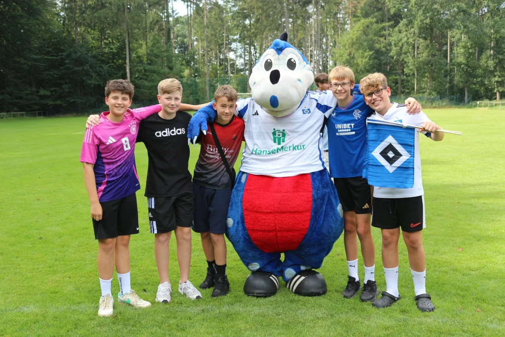 Am Anfang testete DINO Hermann erstmal sein sportliches können. Schwupp nahm er sich ein Tischtennisschläger und spielte ein paar Bälle mit einem Kind. Danach ging es nach draußen wo DINO Hermann mit einem HSV-Fahnenmeer und jeder Menge strahlender Kinderaugen und dem dazugehörigen Applaus begrüßt wurde. Noch kurz eine Runde mit dem Roller und dann wurde mit den Kindern getobt. Wer aber dachte nur die Jungen freuen sich auf DINO HERMANN der sah sich geirrt. Jung und Alt reiten sich in der Schlange ein um ein Foto mit dem schnuckeligen DINO zu bekommen. Der sehr nette HSV DINO erfüllte jeden Wunsch und nahm sich sehr viel Zeit dafür die Wünsche zu erfüllen. Am Ende waren wirklich ALLE Wünsche erfüllt und man sah überall nur strahlende Gesichter, ob Jung oder Alt.
